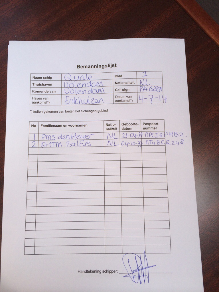 Dag Volendam! by Quale on 04/07/2014 in Uncategorized • 0 Comments Alles ingeladen, tassen uitgepakt, water getankt en moed verzameld! En niet te vergeten de bemanningslijst ingevuld! Dat hebben we nog nooit gedaan! Nadat de schipper iedereen twee keer had geteld, konden we gaan. Op naar Enkhuizen!